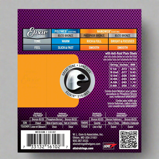 Elixir Phosphor Bronze Nanoweb Guitar Strings, Medium, 13-56
