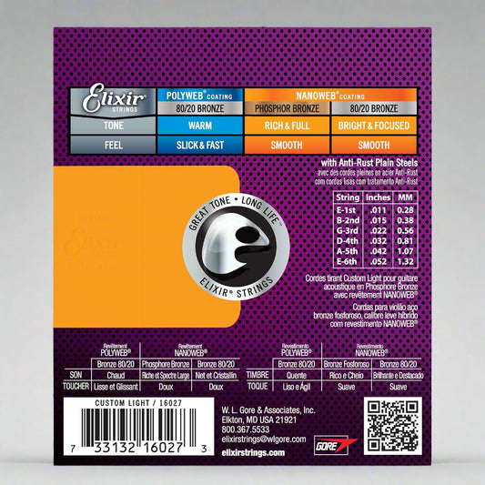 Elixir Phosphor Bronze Nanoweb Guitar Strings, Custom Light, 11-52