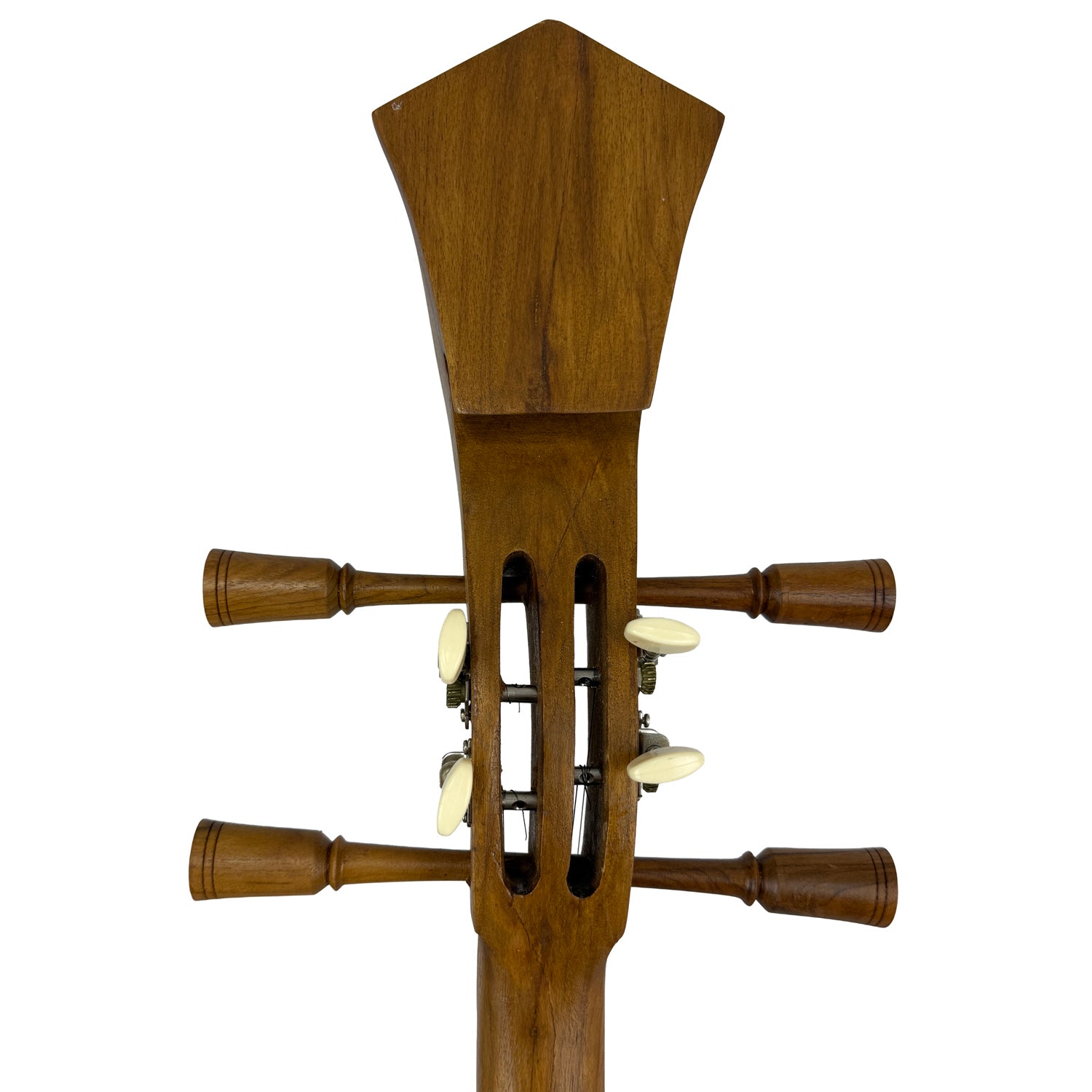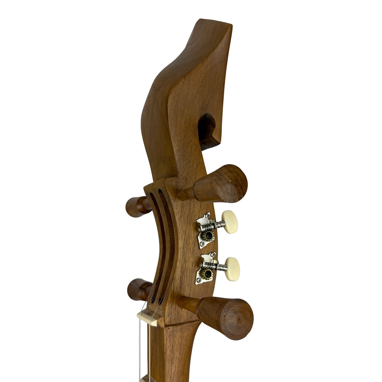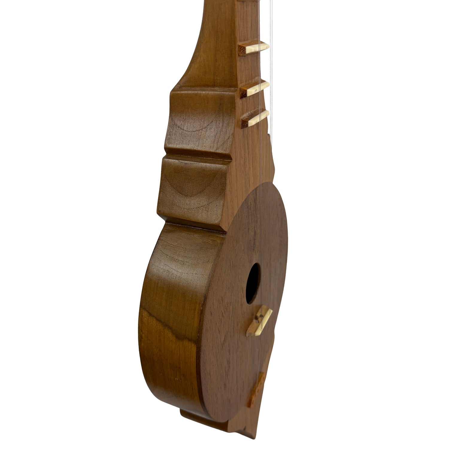 Despite the presence of the traditional wooden tuning pegs, this instrument has modern machine tuners and is strung with 4 plain steel strings in 2 courses, with each course tuned in unison.