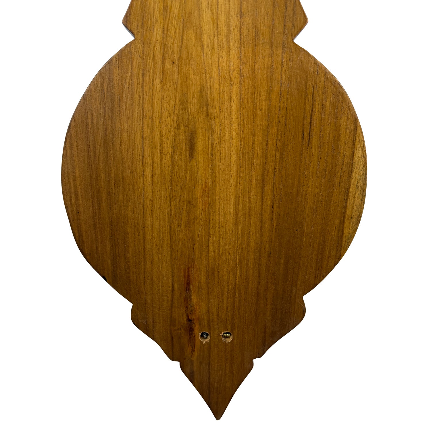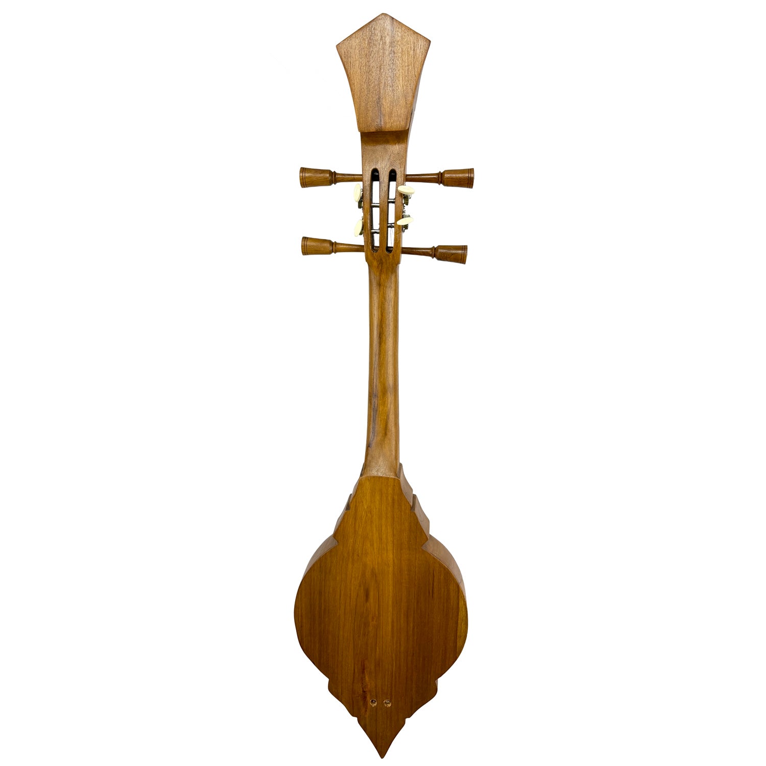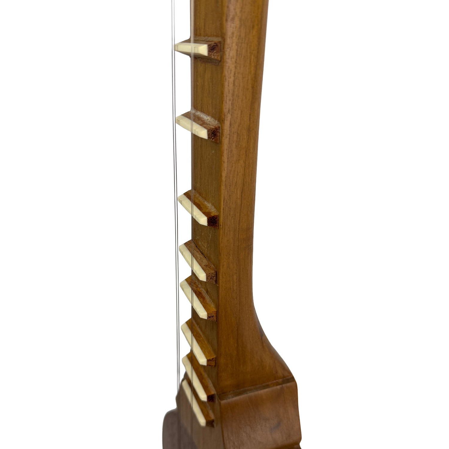 Despite the presence of the traditional wooden tuning pegs, this instrument has modern machine tuners and is strung with 4 plain steel strings in 2 courses, with each course tuned in unison.