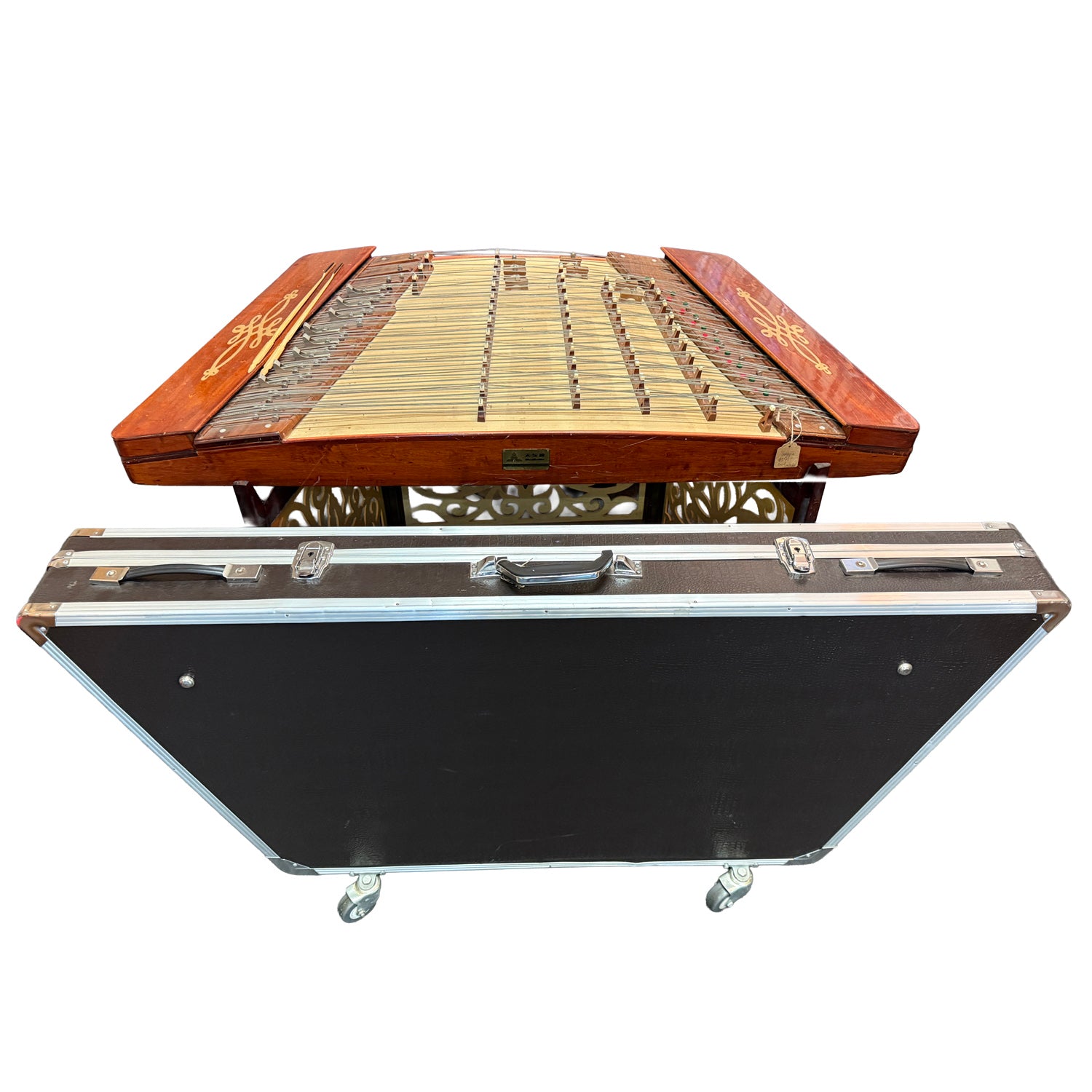 This large model has a 4 octave chromatic range, and is made with a maple wood frame, Dongbei pine soundboard rib, maple sound board, paulownia wood topboard, covered panels over the tuning pins, and comes with tuning wrench and an excellent case with wheels. It's got some dust and scratches and we're selling it as is.