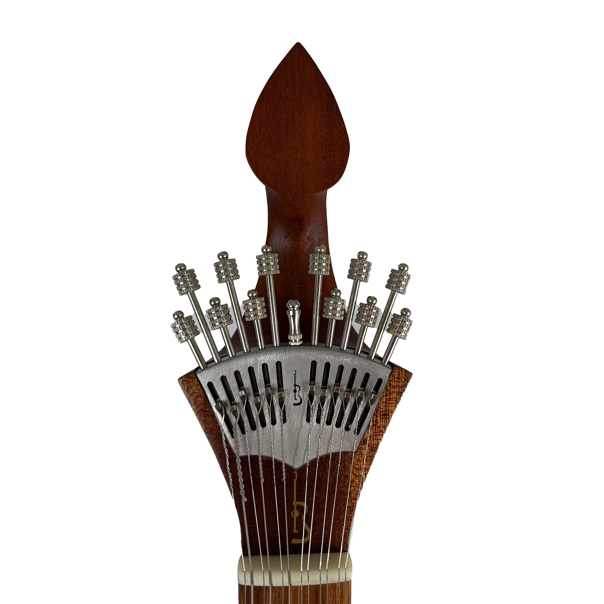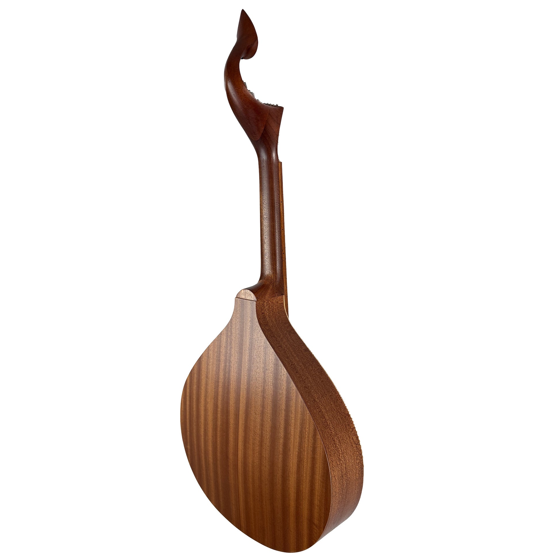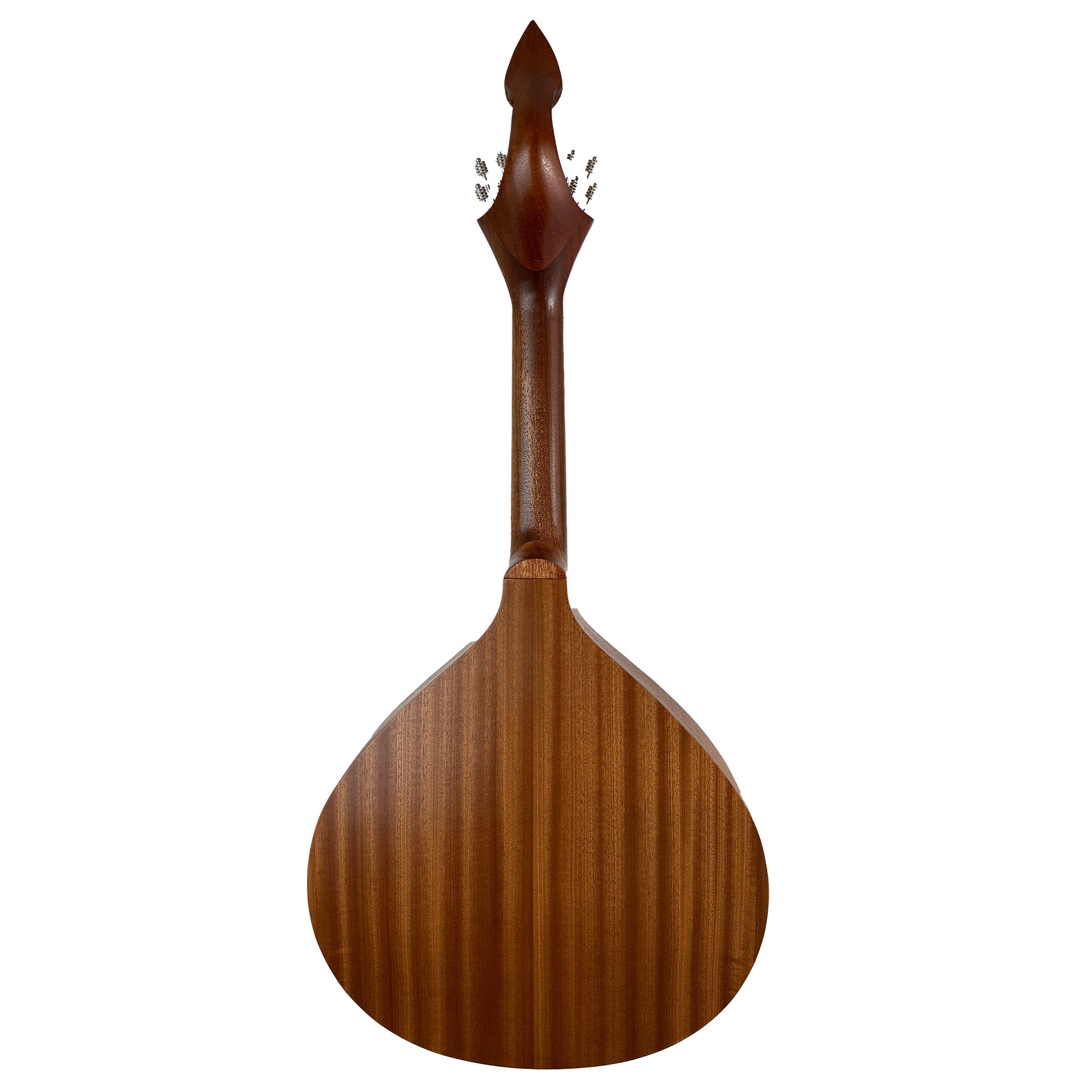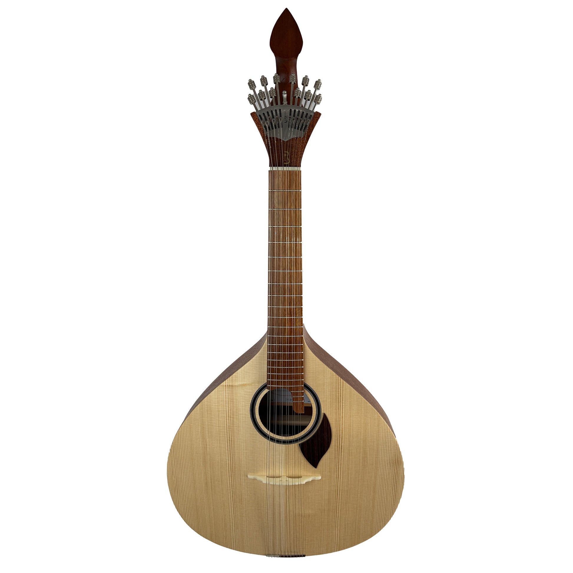 The Portuguese Guitar is a large mandolin-like instrument from Portugal with 12 strings in six courses, associated with the Fado music genre. It has a spruce top and sapele back and sides. Traditional Preston tuners hold the steel strings over the 22 fret curved fretboard. The headstock is carved into a scroll. There are inlays around the sound hole and body, and a small pick guard. Has end pin. Comes with nice soft case.
