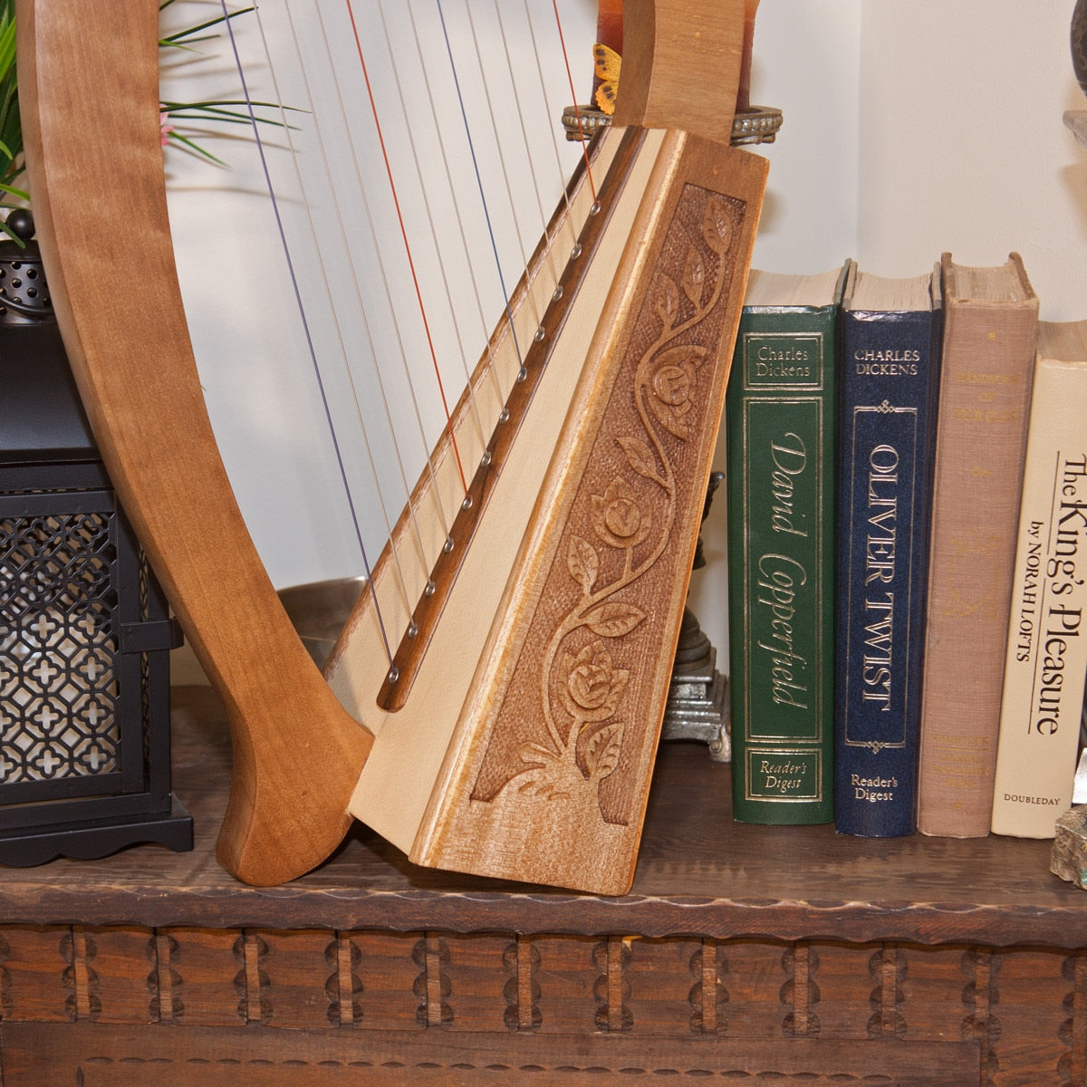 Discover the enchanting world of music with the exquisite Baby Harp TM, 12 Strings. This beautifully crafted instrument is not only a joy to play but also serves as a stunning decorative piece for any space. Standing at 21 inches tall, it is designed to captivate both the eyes and ears with its elegant walnut frame and birch soundboard. Perfect for beginners and seasoned musicians alike, this harp offers a delightful range of notes from F4 to C6, allowing for the easy playing of simple songs.