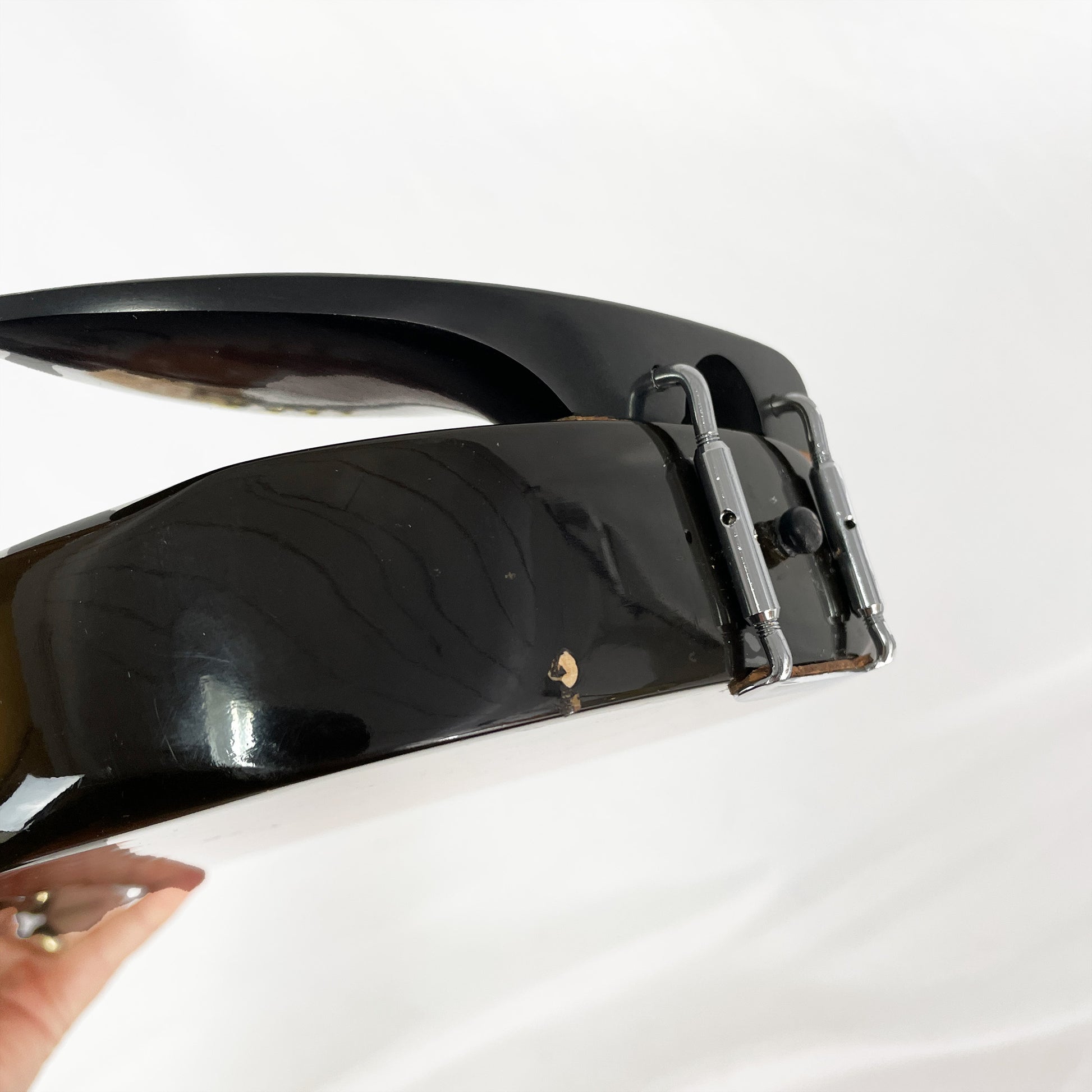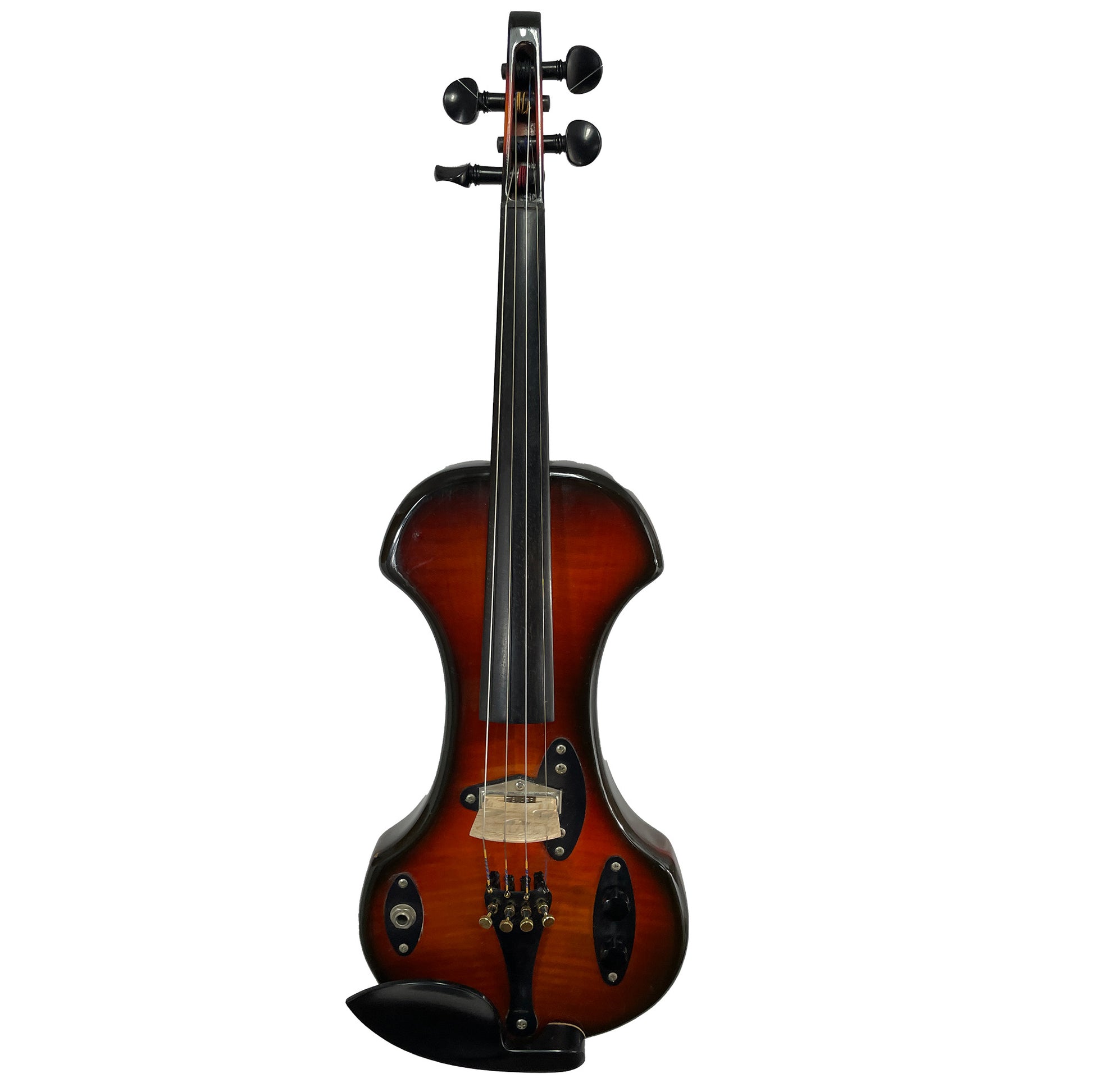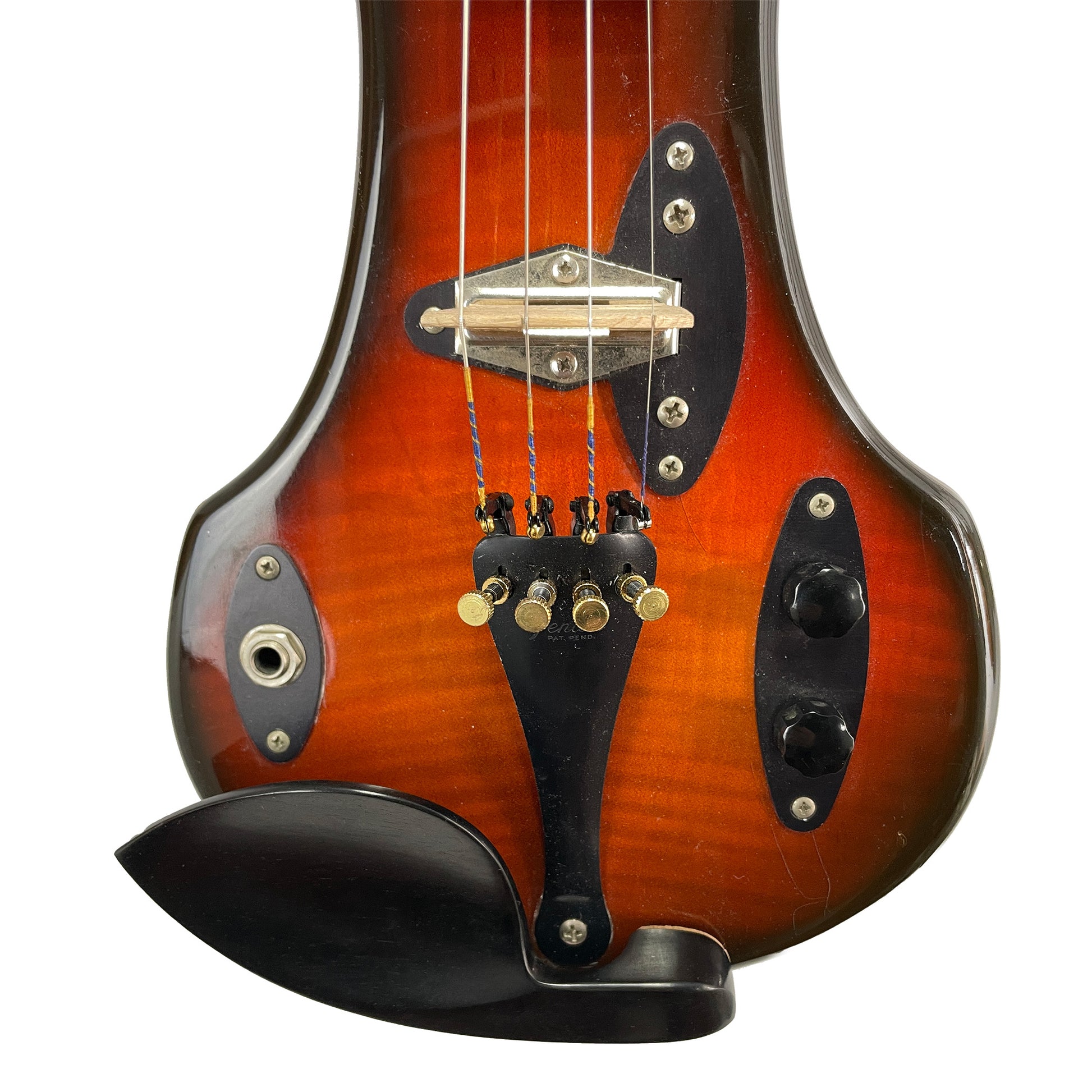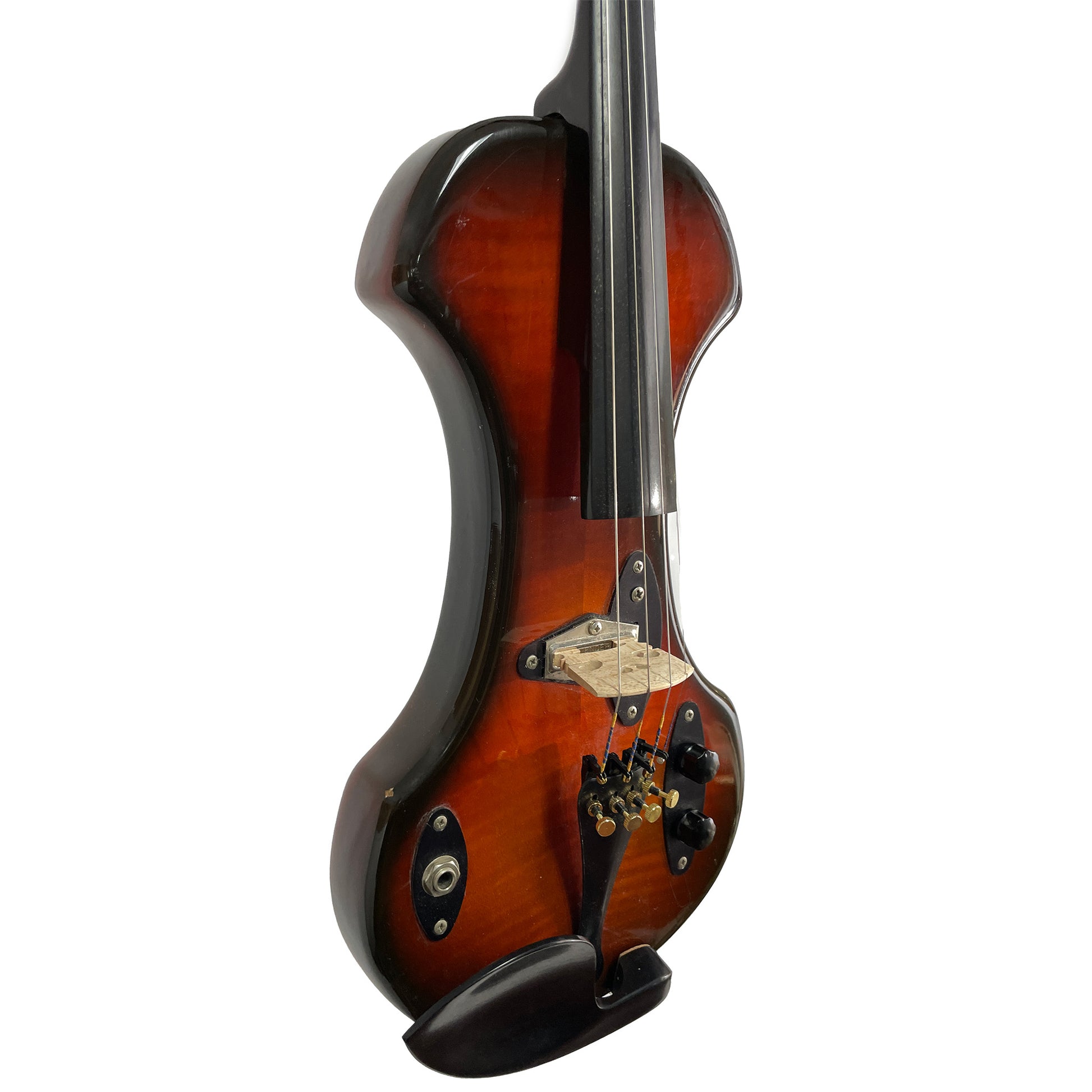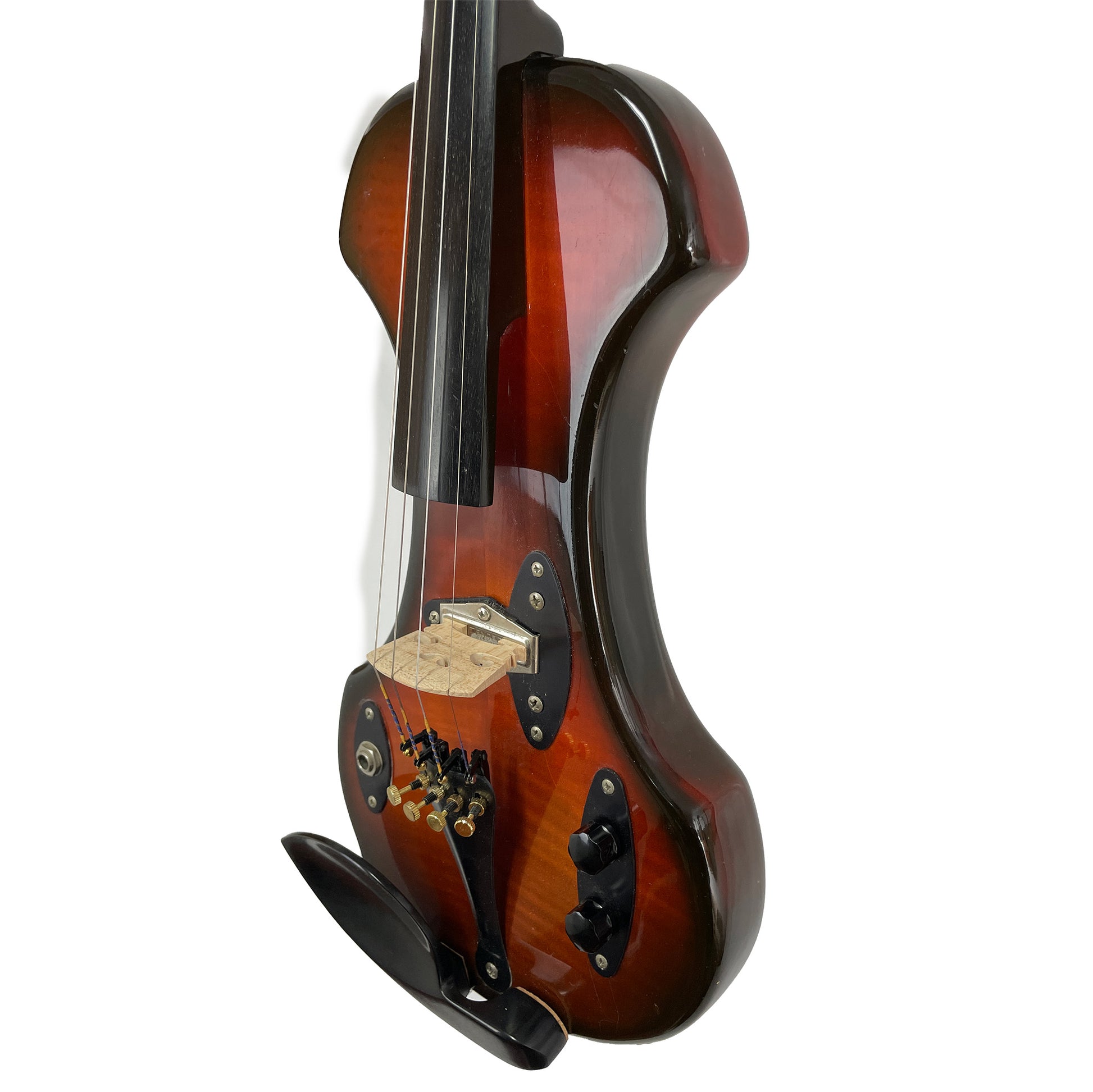 This one, from our Founder's Collection, is in great shape with only a few dings on the body (see photos). It's got a new chinrest and pegs and Helicore electric violin strings.