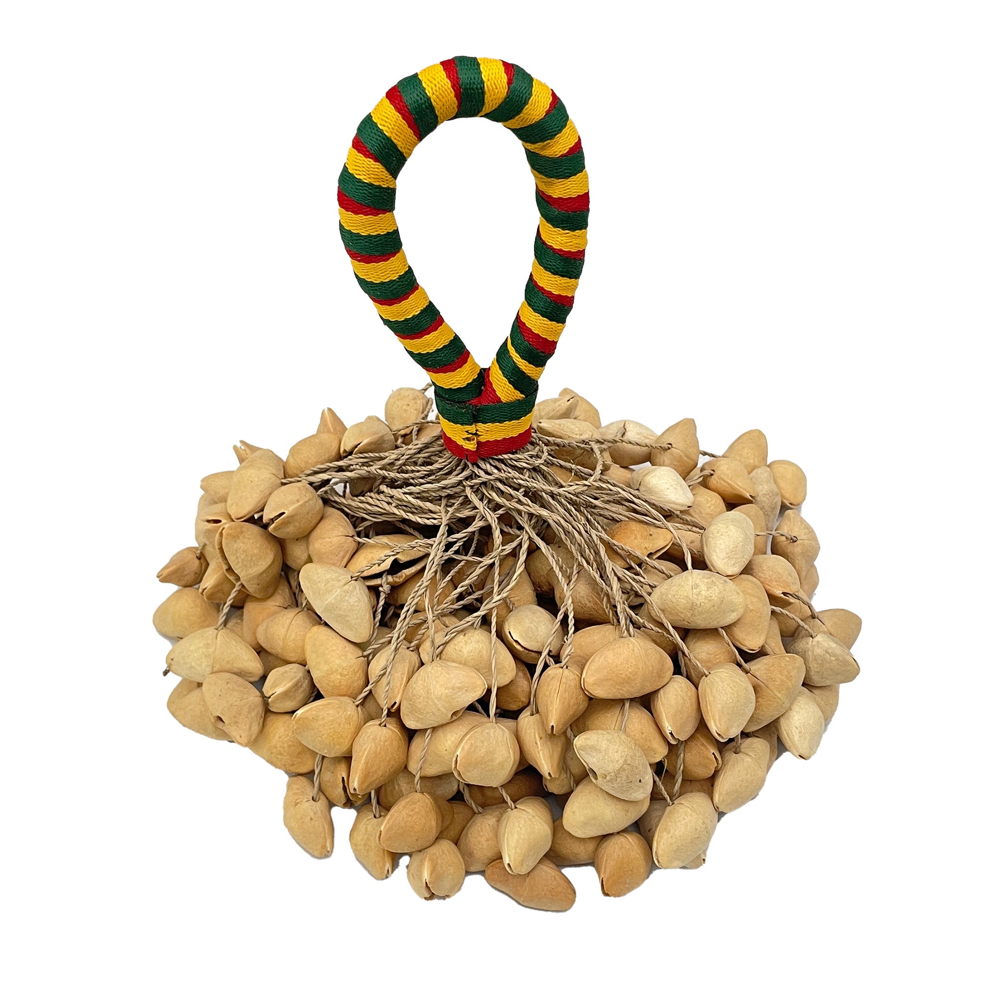 Shaker made from the hard shells of kenari nuts with loop handle. About 200 shells.