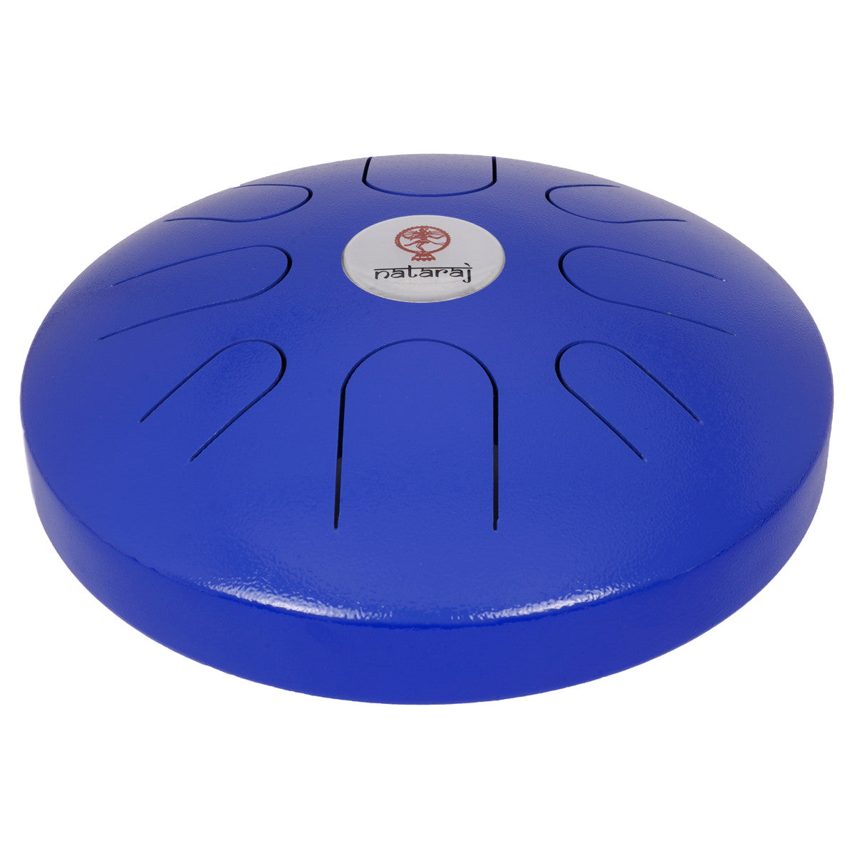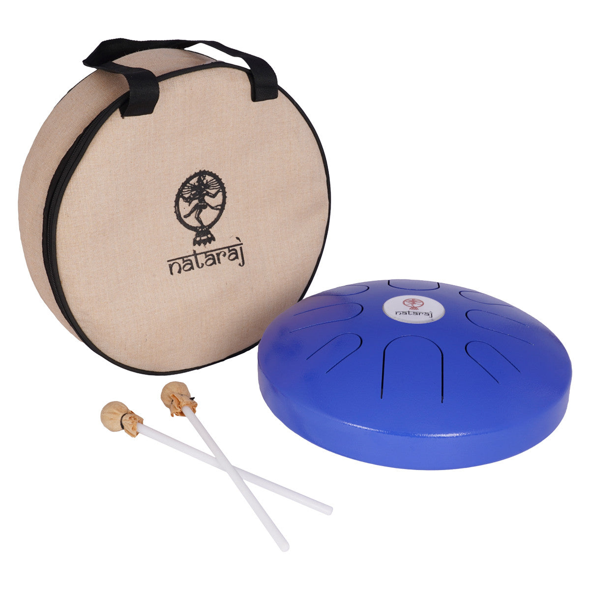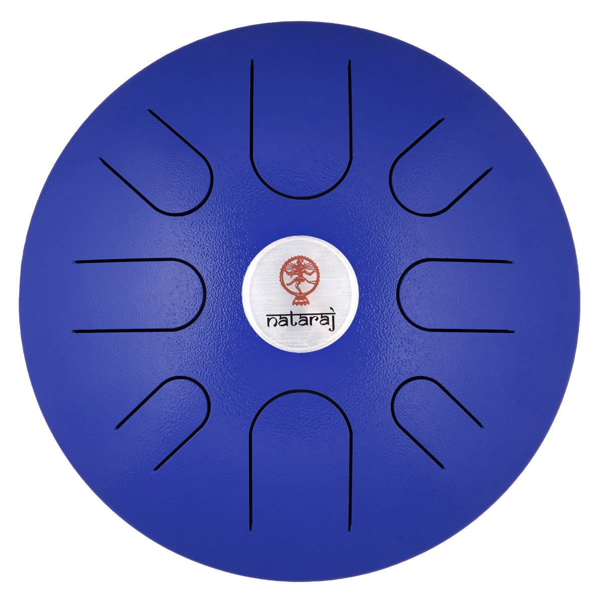 The Nataraj Tongue Drum is a 12-inch handcrafted steel percussion instrument tuned to the A Akebono Scale and finished in Textured Riddhi Blue.
